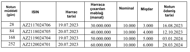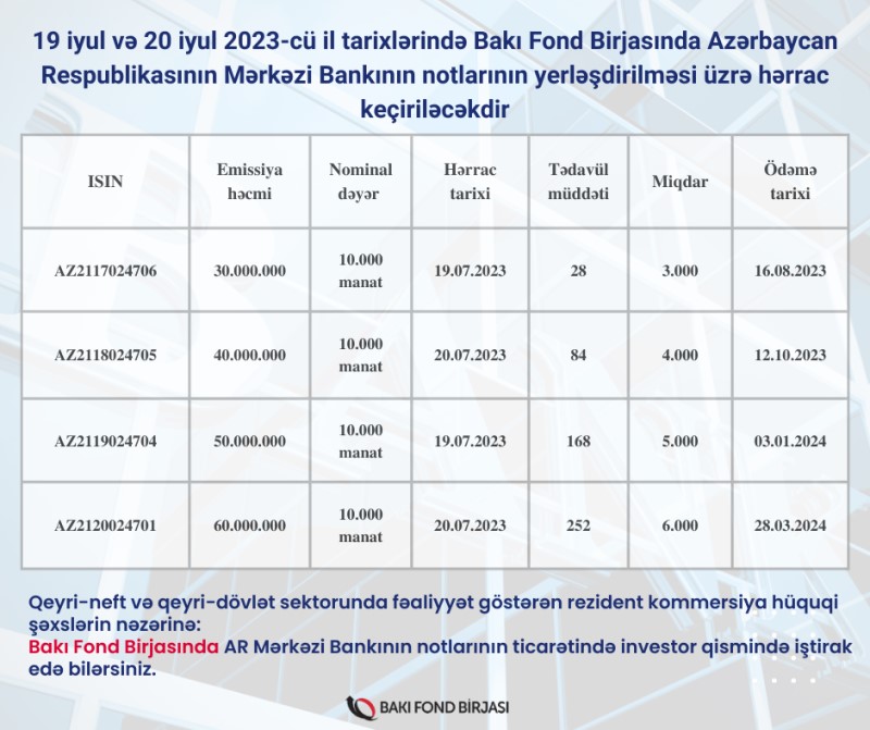 Azərbaycan Respublikasının Mərkəzi Bankının Notlarının yerləşdirilməsi üzrə hərrac keçiriləcəkdir19 iyul və 20 iyul 2023-cü il tarixlərində Bakı Fond Birjasında Azərbaycan Respublikasının Mərkəzi Bankının notlarının yerləşdirilməsi üzrə hərrac keçiriləcəkdir.