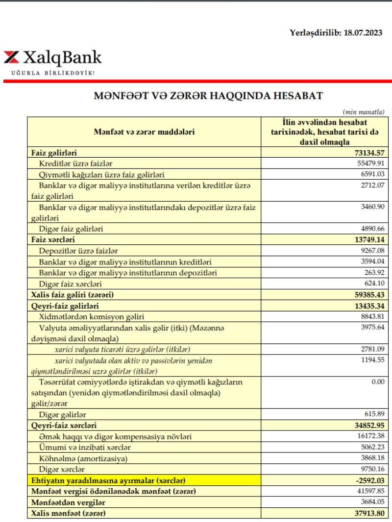 Azərbaycanda fəaliyyət göstərən ən böyük 5 bankdan biri olan "Xalq Bank" 2023-cü ilin birinci yarısını (yanvar-iyun) 37 milyon 914 min manat xalis mənfəət ilə başa vurub. Bank ötən ilin eyni dövrünü 11 milyon 828 min manat xalis mənfəət ilə bağlamışdı. Beləliklə, "Xalq Bank"ın xalis mənfəəti 2023-cü ilin birinci yarısında 3,2 dəfə artıb. Xalis mənfəətin artması gəlirlərin artmasından qaynaqlanır.