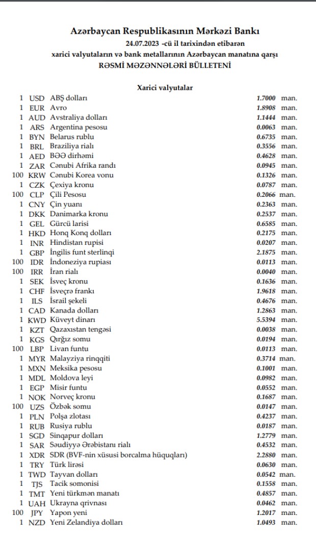 Dolların bazar ertəsi üçün rəsmi məzənnəsi müəyyən olunub
