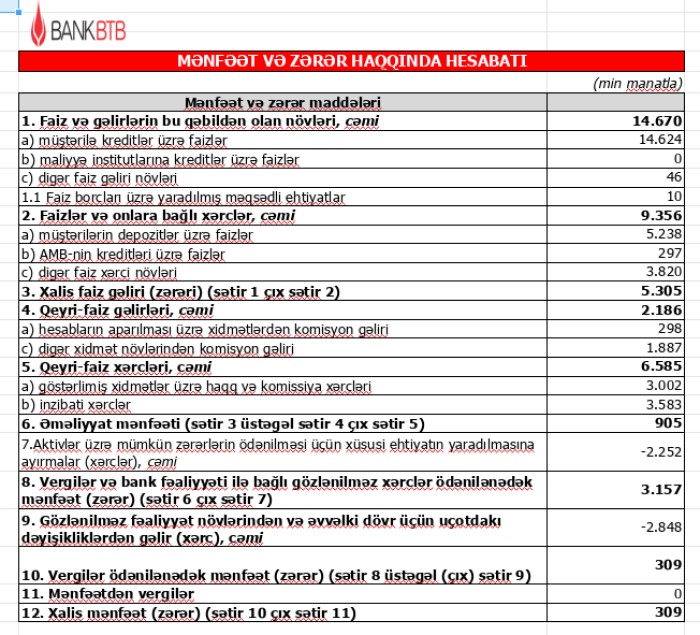 Qeyd edək ki, 2022-ci ilin ilin birinci yarısında "Bank BTB" nin cəmi əməliyyat gəlirləri 16 milyon 59 min manat, cəmi əməliyyat xərcləri 15 milyon 985 min manat, əməliyyat mənfəəti 74 min manat təşkil etmişdi. Bu il Bankın əməliyyat mənfəəti 12 dəfədən çox artıb. Bunun səbəbi Bankın əməliyyat gəlirlərinin artmasına qarşılıq əməliyyat xərclərinin azalmasıdır.