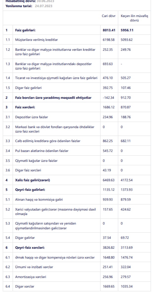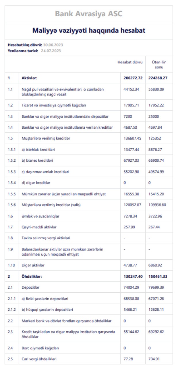 Müqayisə üçün qeyd edək ki, 2022-ci ilin birinci yarısında "Bank Avrasiya"nın əməliyyat mənfəəti 2 milyon 433 min manat təşkil etmişdi və mümkün zərərlər üçün yaradılan məqsədli ehtiyatlara 2 milyon 267 min manat ayırmışdı.