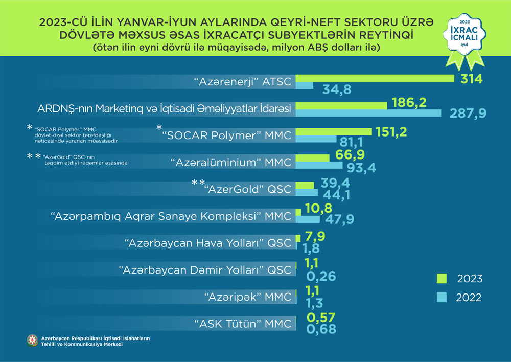 2023-cü ilin yanvar-iyun ayları ərzində ixrac edilən qeyri-neft sektoruna aid malların siyahısında elektrik enerjisi (314,4 milyon ABŞ dolları) birinci olub. Bu siyahıda pomidor (tomat) (120,7 milyon ABŞ dolları) ikinci, pambıq mahlıcı (68,7 milyon ABŞ dolları) isə üçüncü yerdə qərarlaşıb.