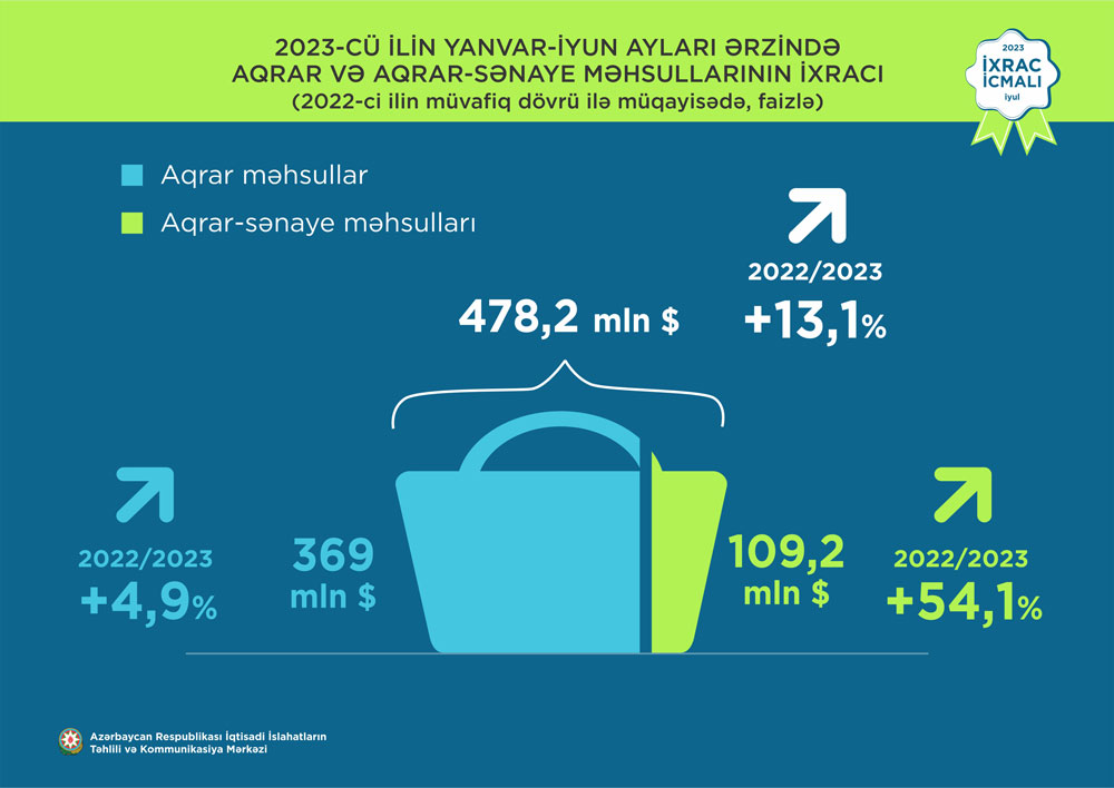 2023-cü ilin yanvar-iyun ayları ərzində aqrar və aqrar-sənaye məhsulları üzrə birgə ixracın statistik dəyəri 13,1% artaraq 478,2 milyon ABŞ dolları təşkil edib. Qeyri-neft/qaz ixracının tərkib hissəsində əhəmiyyətli yer tutan aqrar-sənaye məhsullarının yaratdığı dəyər ötən ilin müvafiq dövrü ilə müqayisədə 54,1% artaraq 109,2 milyon ABŞ dolları təşkil edib.