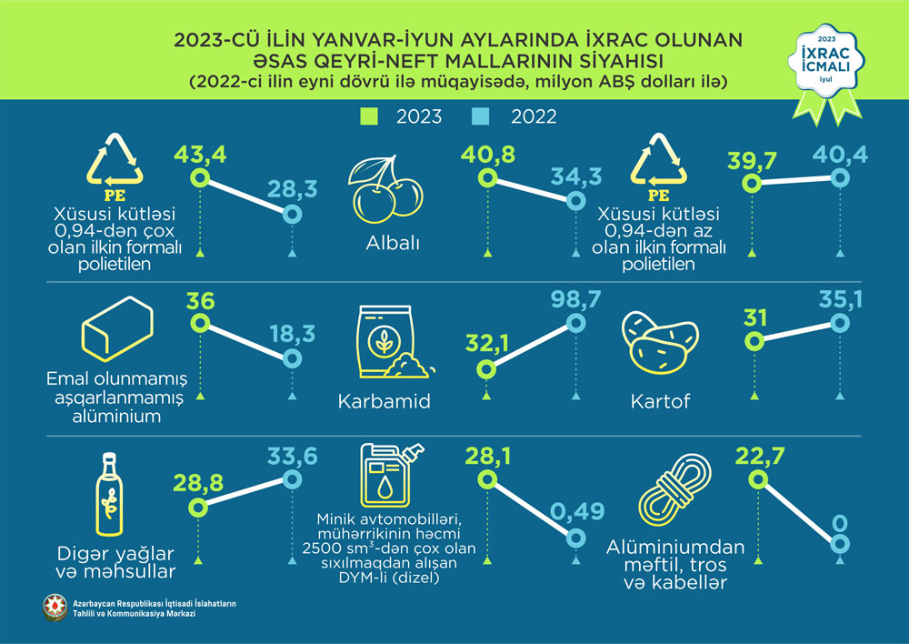 2023-cü ilin iyun ayında ixrac edilən qeyri-neft sektoruna aid malların siyahısında albalı və gilas (40,1 milyon ABŞ dolları) birinci, pomidor (tomat) (29,3 milyon ABŞ dolları) ikinci və pambıq mahlıcı (18,3 milyon ABŞ dolları) üçüncü olub.