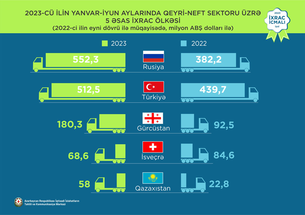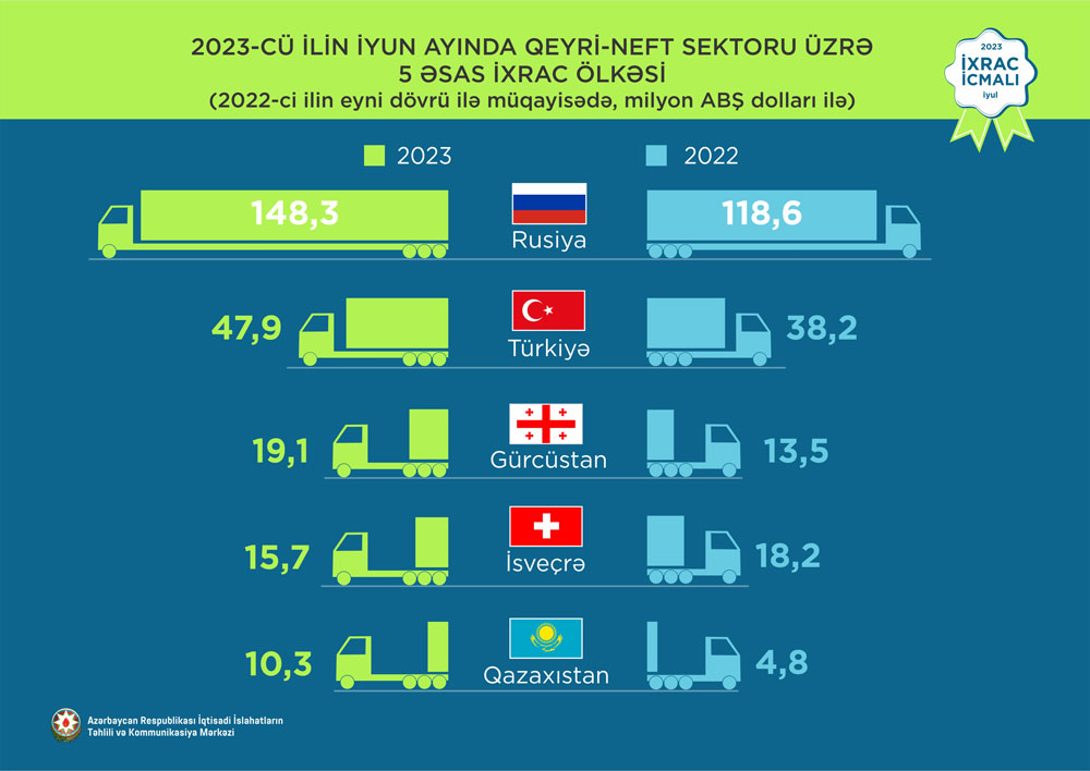 2023-cü ilin yanvar-iyun ayları ərzində Rusiya Federasiyasına 552,3 milyon ABŞ dolları, Türkiyəyə 512,5 milyon ABŞ dolları, Gürcüstana 180,3 milyon ABŞ dolları, İsveçrə Konfederasiyasına 68,6 milyon ABŞ dolları, Qazaxıstana isə 58 milyon ABŞ dolları dəyərində qeyri-neft sektoruna aid mal ixrac olunub.
