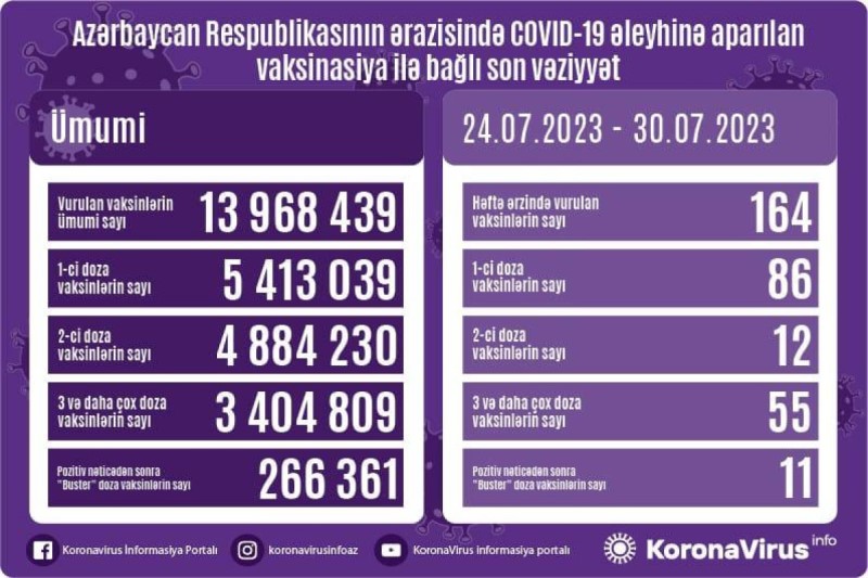 Azərbaycanda iyulun 24-dən 30-dək koronavirus (COVID-19) əleyhinə 164 vaksin vurulub. Həftə ərzində birinci mərhələ üzrə vaksinasiya olunanların sayı 86, ikinci mərhələ üzrə vaksinasiya olunanların sayı 12, üç və daha çox doza vaksin vurduranların sayı 55, pozitiv nəticədən sonra buster doza üzrə vaksinasiya olunanların sayı isə 11 nəfərdir.
