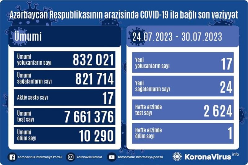 Azərbaycanda son 1 həftədə 17 nəfər COVID-19-a yoluxub, 1 nəfər ölübAzərbaycanda koronavirus (COVID-19) infeksiyasına son 1 həftədə (24-30 iyul) 17 yeni yoluxma faktı qeydə alınıb, 24 nəfər müalicə olunaraq sağalıb.