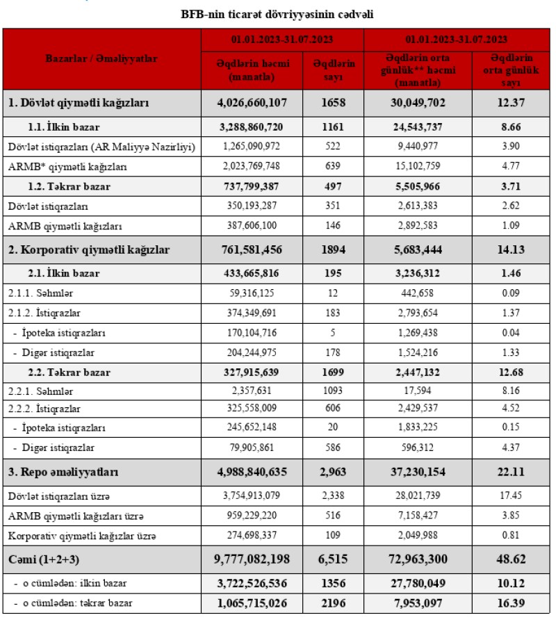 Qeyd edilib ki, ötən ilin müvafiq dövrü ilə müqayisədə korporativ qiymətli kağızaların ilkin bazarı üzrə ticarət həcmində 27%, korporativ qiymətli kağızların təkrar bazarı üzrə isə 39% böyümə qeydə alınıb, repo əməliyyatları üzrə 61% artım olub. O cümlədən, ötən il ilə müqayisədə korporativ qiymətli kağızların repo əməliyyatların bazarı üzrə 9 dəfə artım baş verib.