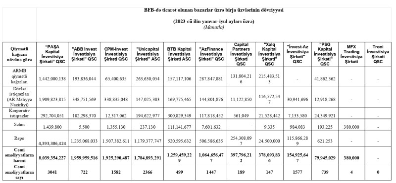 Marja.az xəbər verir ki, 2023-cü ilin yanvar-iyul ayları üzrə “PAŞA Kapital İnvestisiya Şirkəti” QSC 8 milyard 39 milyon 354 min manat dövriyyə ilə 1-ci, "ABB İnvest İnvestisiya Şirkəti" QSC 1 milyard 959 milyon 960 min manat dövriyyə ilə 2-ci, "CPM-İnvest İnvestisiya Şirkəti" QSC şirkəti 1 milyard 925 milyon 290 min manat dövriyyə ilə 3-cü olub.