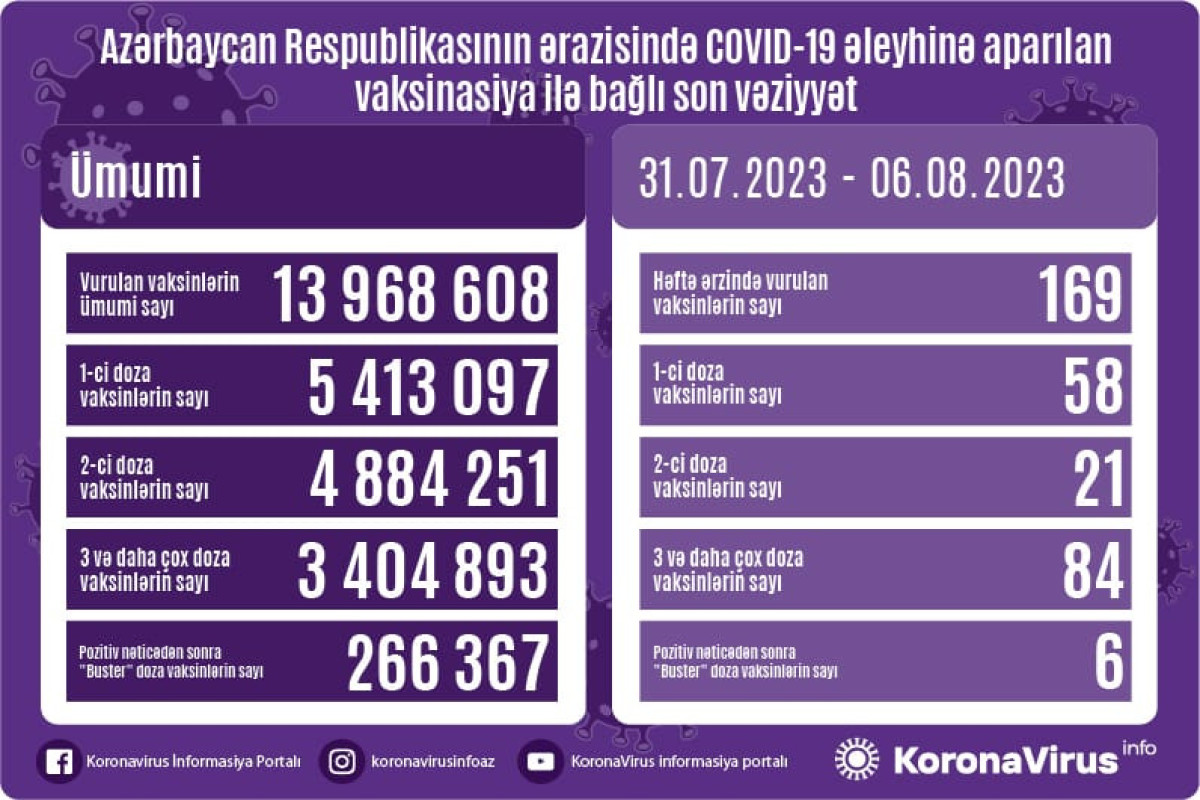 Azərbaycanda iyulun 31-dən avqustun 6-dək koronavirus (COVID-19) əleyhinə 169 vaksin vurulub. Həftə ərzində birinci mərhələ üzrə vaksinasiya olunanların sayı 58, ikinci mərhələ üzrə vaksinasiya olunanların sayı 21, üç və daha çox doza vaksin vurduranların sayı 84, pozitiv nəticədən sonra buster doza üzrə vaksinasiya olunanların sayı isə 6 nəfərdir.