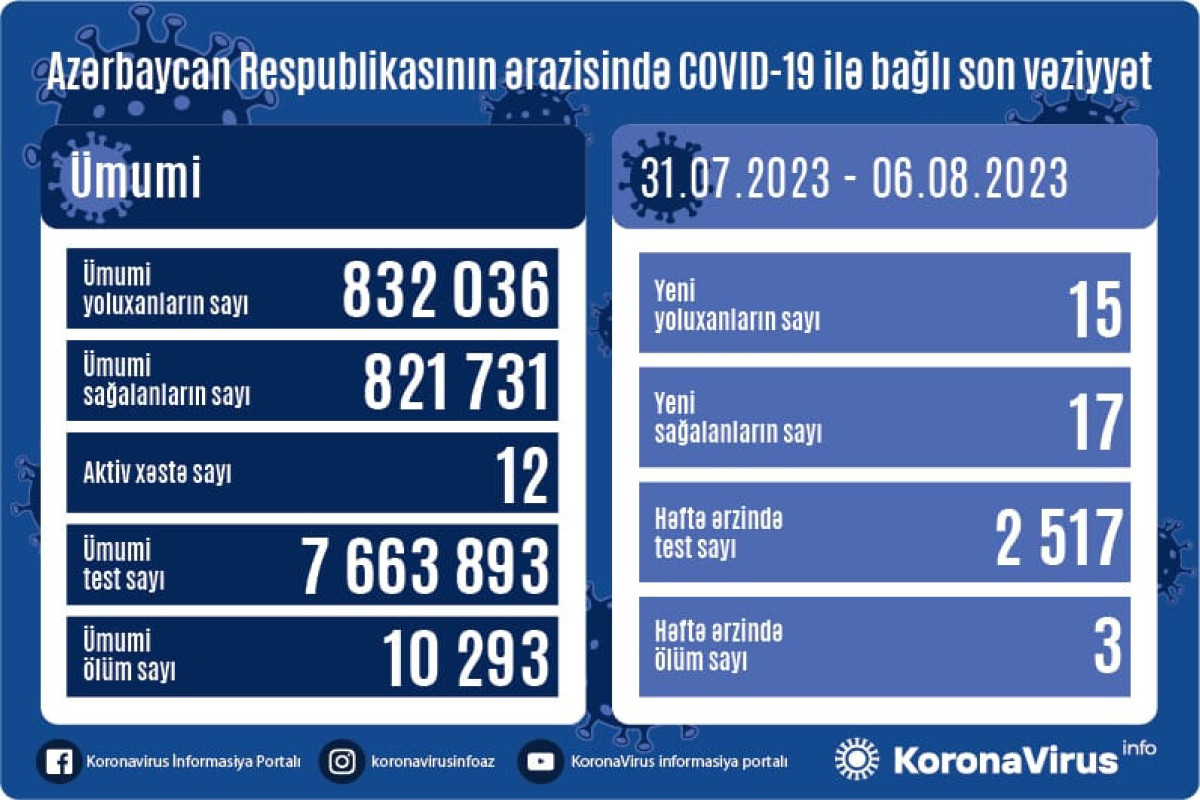 Azərbaycanda koronavirus (COVID-19) infeksiyasına son 1 həftədə (31.07.2023-06.08.2023) 15 yeni yoluxma faktı qeydə alınıb, 17 nəfər müalicə olunaraq sağalıb.