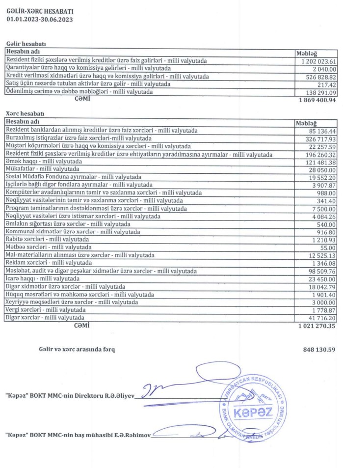 "Kəpəz" Bank Olmayan Kredit Təşkilatı 2023-cü ilin birinci yarısını (yanvar-iyun) 848 min manat mənfəət ilə başa vurub.