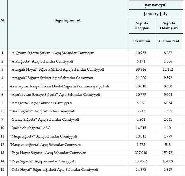 2023-cü ilin yanvar-iyul dövründə (7 ay) Azərbaycanın sığorta şirkətləri tərəfindən 761 milyon 801 min manat sığorta haqları hesablanıb, 282 milyon 977 min manat sığorta ödənişləri həyata keçirilib.