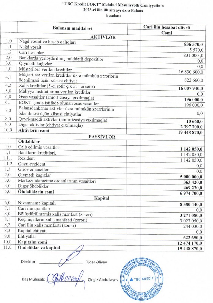 30 iyun 2022-ci il tarixində "TBC Kredit BOKT"ın kredit portfeli (müştərilərə verilmiş kreditlər) 15 milyon 670 min manat ikən, 30 iyun 2023-cü il tarixində 16 milyon 831 min manata çatıb. Təşkilatın cəmi aktivləri 18 milyon 259 min manatdan 19 milyon 449 min manata yüksəlib.