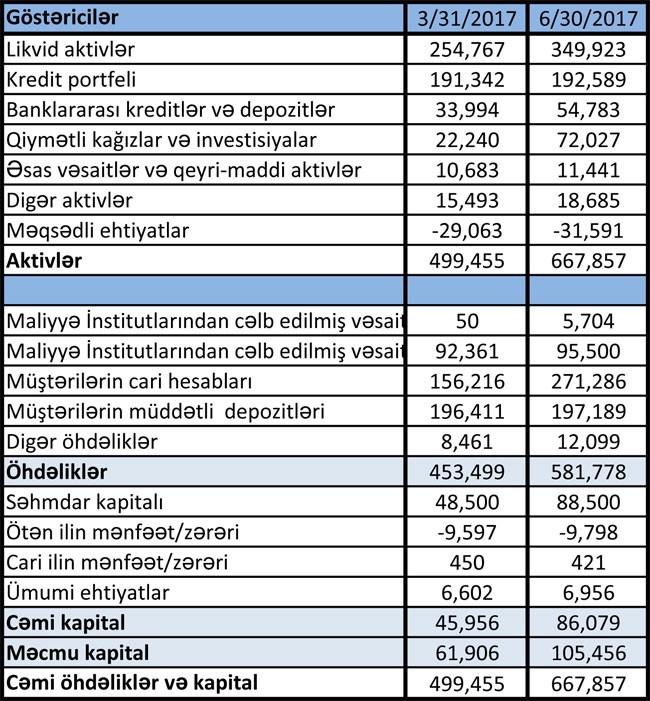 Müqayisə olunan dövrdə Bankın kredit portfeli 205 milyon 205 min manatdan 192 milyon 589 min manata, müştərilərin müddətli depozitləri 255 milyon 474 min manatdan 197 milyon 189 min manata düşüb, müştərilərin cari hesabları isə 148 milyon 782 min manatdan 271 milyon 286 min manata qalxıb.