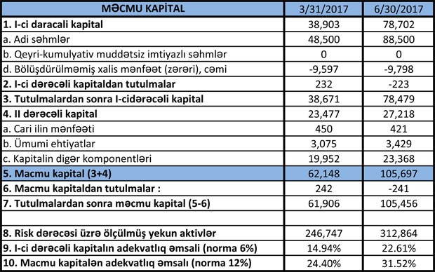 2016-cı ilin birnci yarısı ilə müqayisədə cari ilin 6 ayında Bankın faiz gəlirləri 15 milyon 584 min manatdan 12 milyon 121 min manata düşsə də, qeyri-faiz gəlirləri 70%-ə yaxın artaraq 4 milyon 609 min manatdan 7 milyon 804 min manata qalxıb.