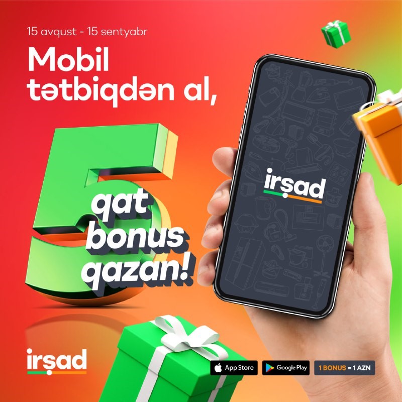 Qeyd edək ki, hər iki kampaniyalara özəl 15 sentyabradək "İrshad" mobil tətbiqindən edilən istənilən nağd, hissəli alış və ya kartla birdəfəlik ödəniş zamanı 1 yox, 2 yox, düz 5 QAT BONUS verilir! Toplanan bonuslarla növbəti alış zamanı seçdiyin məhsulu daha da endirimli qiymətlə əldə etmək fürsəti səni gözləyir!