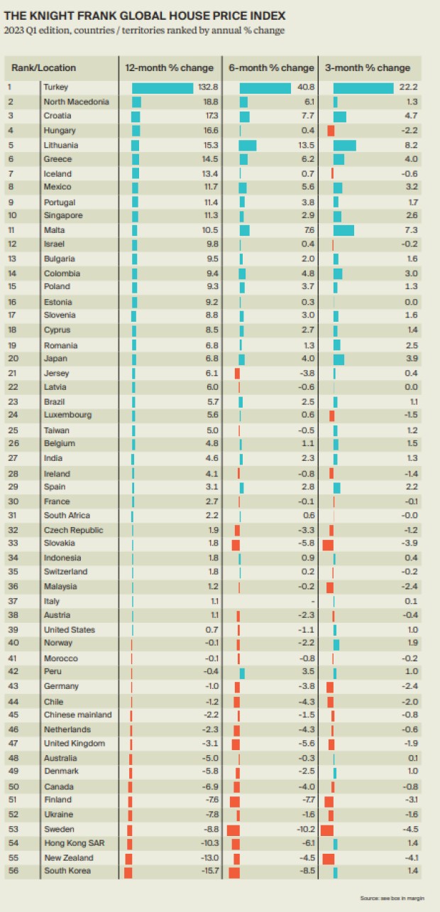 Marja.az xəbər verir ki, daşınmaz əmlak üzrə beynəxlaq məsləət şirkəti "Knight Frank"ın 56 ölkə və bölgəni təhlil etdiyi Qlobal Ev Qiymətləri İndeksinə görə, 2023-cü ilin birinci rübündə mənzil qiymətləri ən çox Türkiyədə artıb.