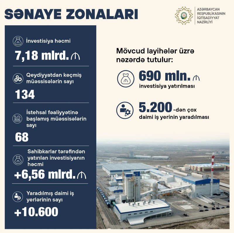 İndiyədək sənaye zonalarında 134 sahibkarlıq subyektinə rezidentlik statusu verilib və bunlardan artıq 68-i fəaliyyətə başlayıb. Sənaye zonaları üzrə ümumi investisiya həcmi 7,18 mlrd. manatdır. Sahibkarlar tərəfindən artıq bu günədək 6,56 milyard manatdan çox investisiya yatırılıb və 10600-dən çox daimi iş yeri yaradılıb. Növbəti mərhələdə mövcud layihələr üzrə sənaye zonalarına əlavə olaraq 690 milyon manata yaxın investisiyanın yatırılması, 5200-dən artıq daimi iş yerinin yaradılması nəzərdə tutulur.