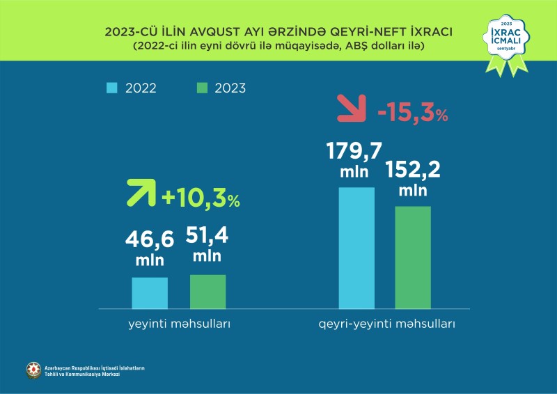 Cari ilin avqust ayının qeyri-neft ixracı 203,6 milyon ABŞ dolları olub. Bunun da 51,4 milyon ABŞ dollarını (10,3% artım) yeyinti məhsulları üzrə ixrac, 152,2 milyon ABŞ dollarını isə qeyri-yeyinti məhsulları üzrə ixrac təşkil edib.