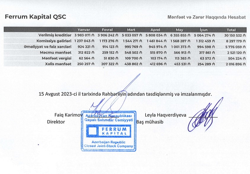 Faktorinq məhsulları ilə alıcılara hissə-hissə ödəniş imkanı yaradan "Ferrum Kapital"ın dövriyyəsi azalıb."AQA Şirkətlər Qrupu" QSC-yə daxil olan və faktorinq xidmətləri göstərən "Ferrum Kapital" QSC 2023-cü ilin ilk 6 ayını (yanvar-iyun) 2 milyon 17 min manat xalis mənfəət ilə başa vurub. Şirkət ötən ilin eyni dövrünü 2 milyon 369 min manat xalis mənfəət ilə bağalmışdı. Beləliklə, Şirkətin yarımillik xalis mənfəəti 352 min manat azalıb.