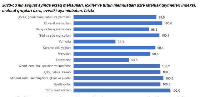 2023-cü ilin avqust ayında ərzaq məhsulları, içkilər və tütün məmulatları üzrə istehlak qiymətləri indeksi əvvəlki aya nisbətən 0,9 faiz azalıb, əvvəlki ilin avqust ayına nisbətən 7,4 faiz yüksəlib.
