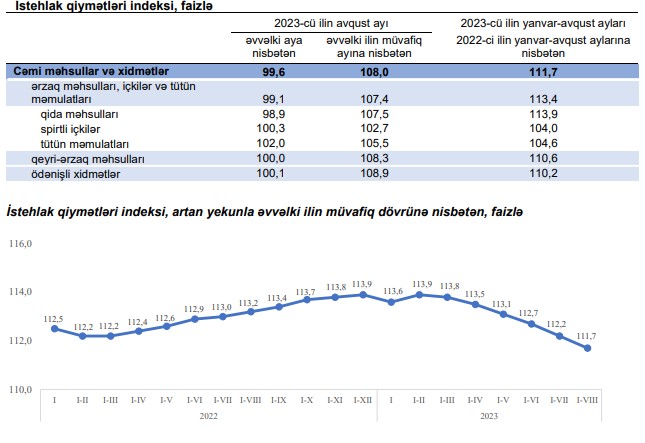 Azərbaycanda illik inflyasiyanın sürəti 9,4 faizdən 8 faizə düşüb.2023-cü ilin yanvar-avqust aylarında istehlak qiymətləri indeksi (inflyasiya göstəricisi) 2022-ci ilin yanvar-avqust aylarına nisbətən 11,7 faiz, o cümlədən ərzaq məhsulları, içkilər və tütün məmulatları üzrə 13,4 faiz, qeyri-ərzaq məhsulları üzrə 10,6 faiz, əhaliyə göstərilmiş ödənişli xidmətlər üzrə 10,2 faiz artıb.