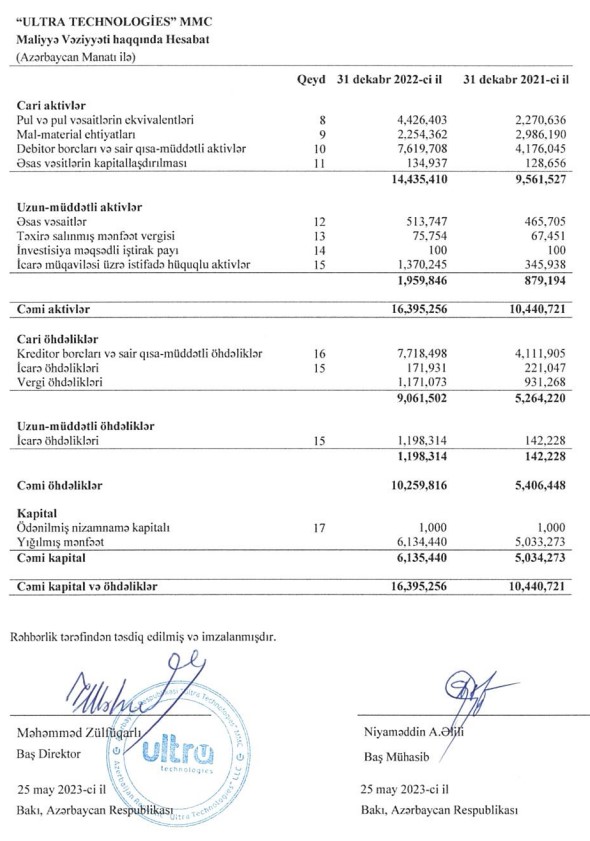 31 dekabr 2022-ci il tarixində “Ultra Technologies” şirkəti 16 milyon 395 min manat cəmi aktivlərə malik olub. Şirkət 2021-ci ilin sonunda 10 milyon 440 min manat cəmi aktivlərə malik idi.