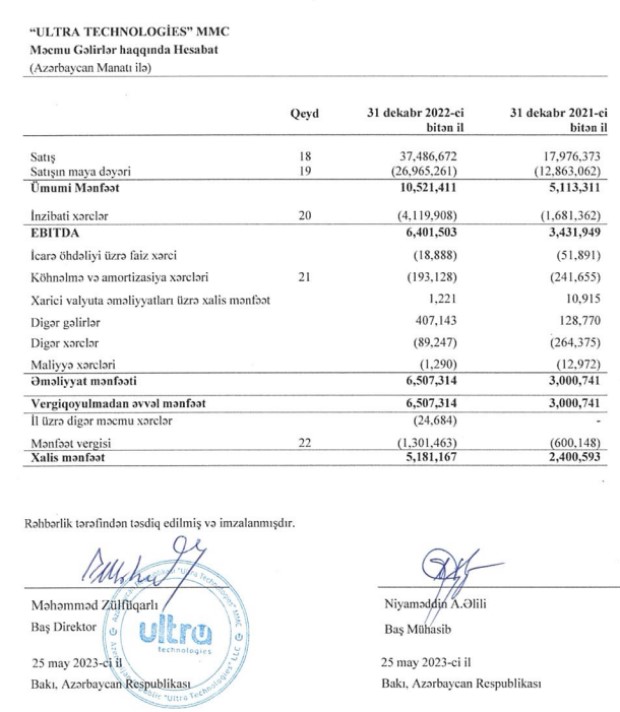 Marja.az xəbər verir ki, “Ultra Technologies” şirkətinin əsas əməliyyat gəlirləri (satış) 2021-ci ildə 17 milyon 976 min manat ikən, 2022-ci ildə 37 milyon 487 min manata yüksəlib (2,1 dəfə artıb).