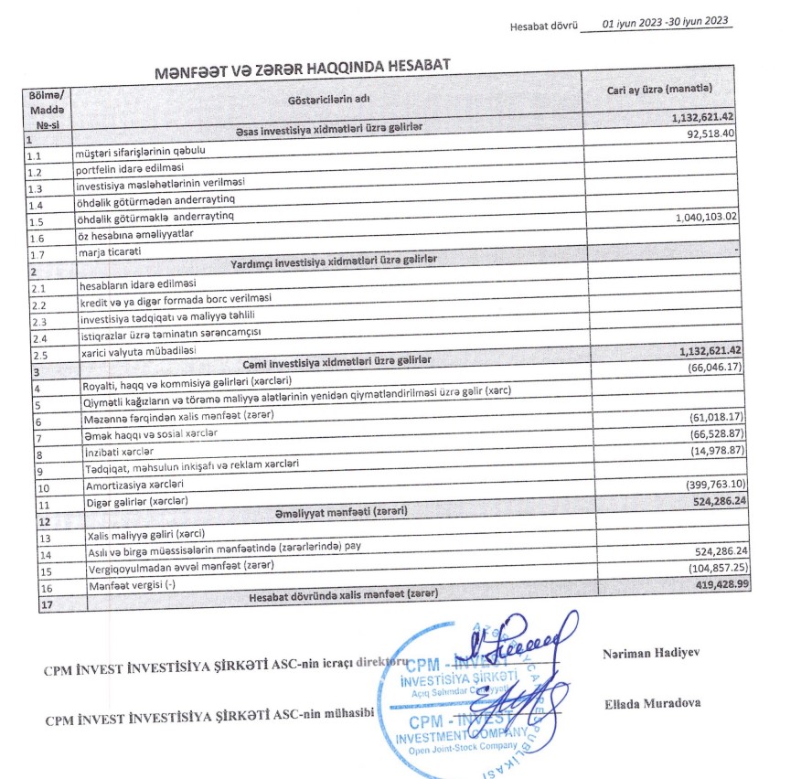 "CPM-İnvest İnvestisiya Şirkəti" ASC 2023-cü ilin 1-ci yarısını (yanvar-iyun) 419 min manat xalis mənfəət ilə başa vurub.