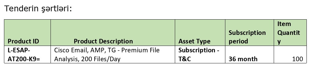 (®) "Rabitəbank" ASC “Cisco ESA (Email Security Appliance) lisenziyasının 3 illik uzadılması” ilə bağlı tender elan edir.