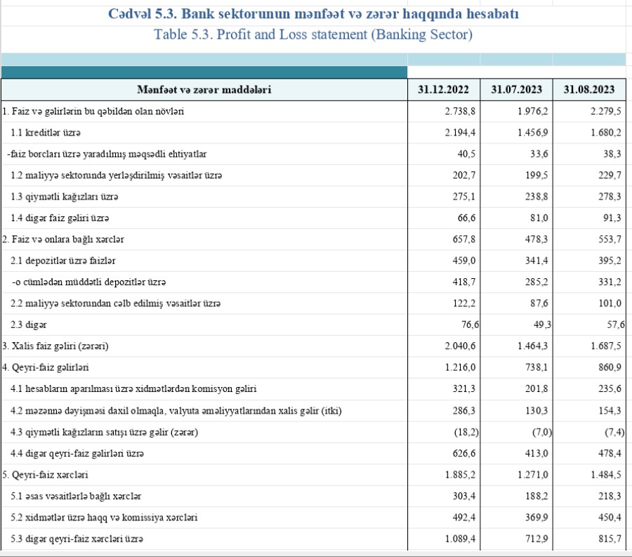 Azərbaycan Mərkəzi Bankı 2023-cü ilin 8 ayı üzrə bank sektoru üzrə göstəriciləri açıqlayıb.