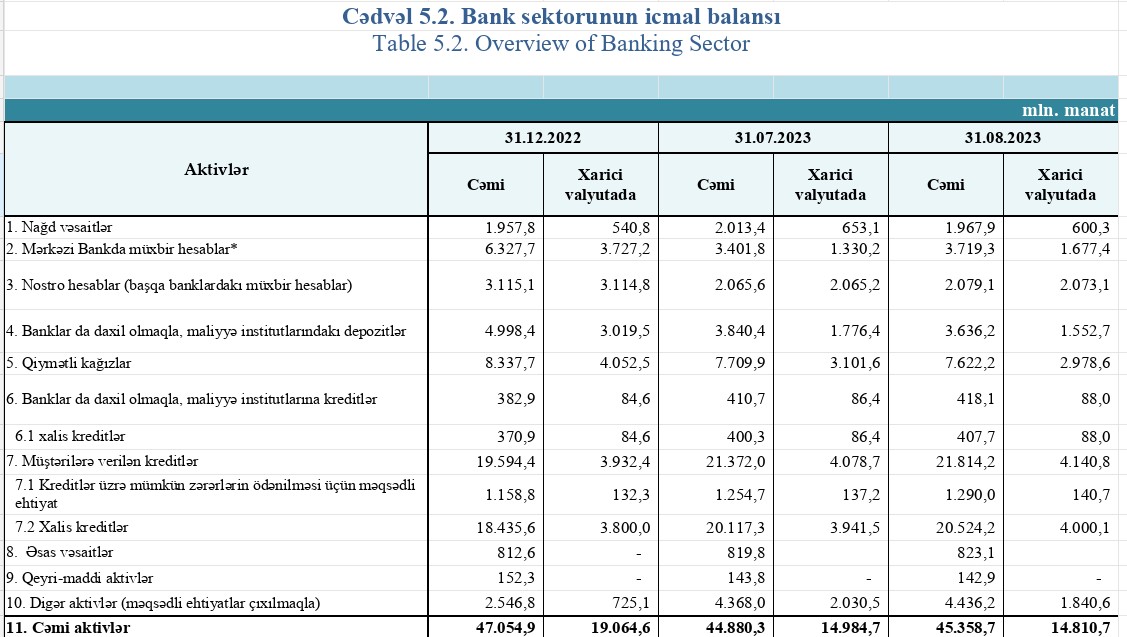 31 avqust 2023-cü il tarixində bankların qiymətli kağızlara cəmi investisiyaları 7 milyard 622,16 milyon manat təşkil edib. Bu məbləğ ötən ilin sonunda 8 milyard 337,69 milyon manat, iyul ayının sonunda isə 7 milyard 709,9 milyon manat idi.