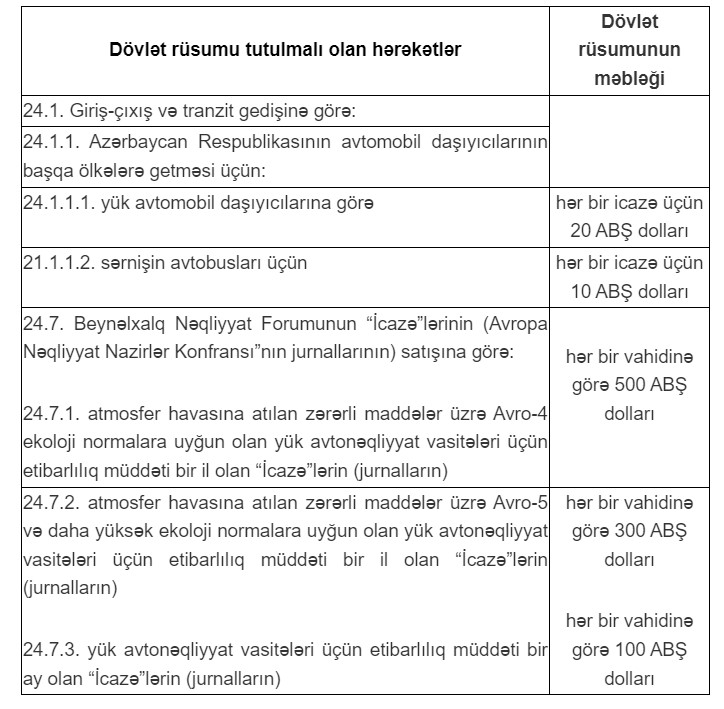 İndiyə qədər qüvvədə olan qanuna əsasən isə yalnız Azərbaycan Respublikası ərazisində beynəlxalq avtomobil daşımalarını tənzimləyən icazənin verilməsi üçün dövlət rüsumunun tutulduğu hallar sırasında yer alıb. Sabahdan qüvvəyə minəcək qanuna əsasən isə avtomobil nəqliyyatı ilə sərnişin və yük daşımalarına icazənin verilməsi üçün dövlət rüsumunun dərəcələri də müəyyənləşir.
