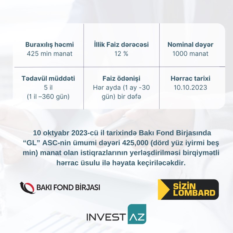 Birjadan Marjaya daxil olmuş məlumatda bildirilir ki, 10 oktyabr 2023-cü il tarixində Bakı Fond Birjasında “GL” ASC-nin ümumi dəyəri 425,000 (dörd yüz iyirmi beş min) manat olan istiqrazlarının yerləşdirilməsi birqiymətli hərrac üsulu ilə həyata keçiriləcəkdir.