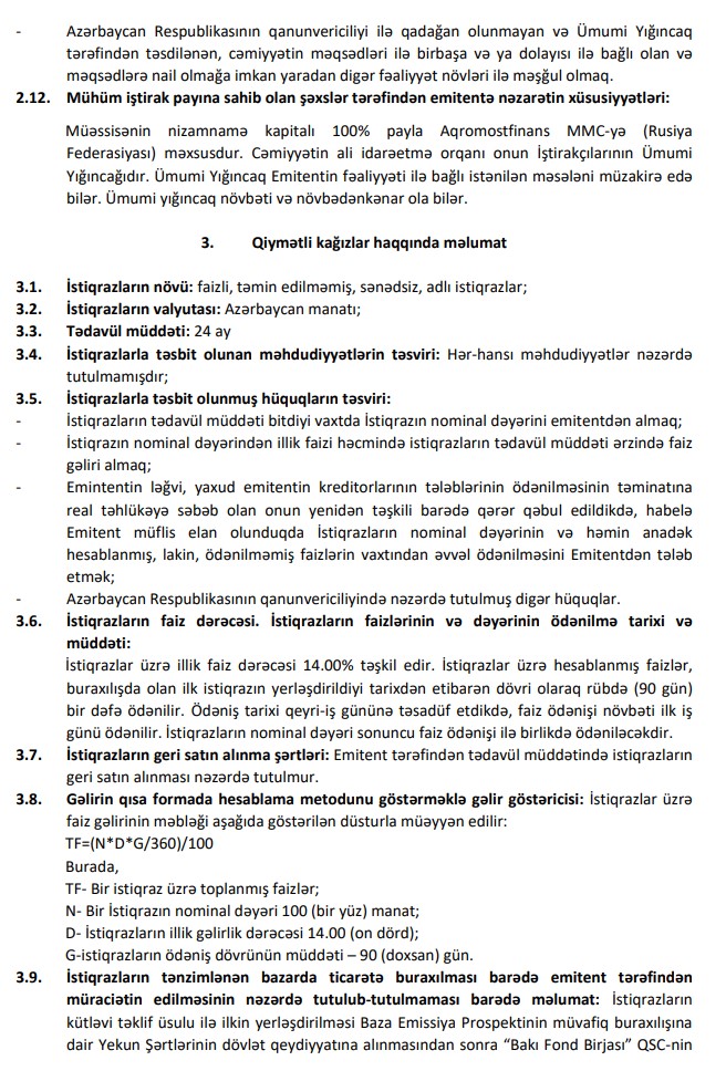 3-cü buraxılış üzrə 500 000 (beş yüz min) manat həcmində, 24 ay, illik 14%;