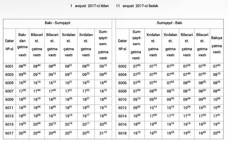 Avqustun 1-dən Bakı-Sumqayıt-Bakı elektrik qatarlarının hərəkət cədvəlində dəyişiklik ediləcək.