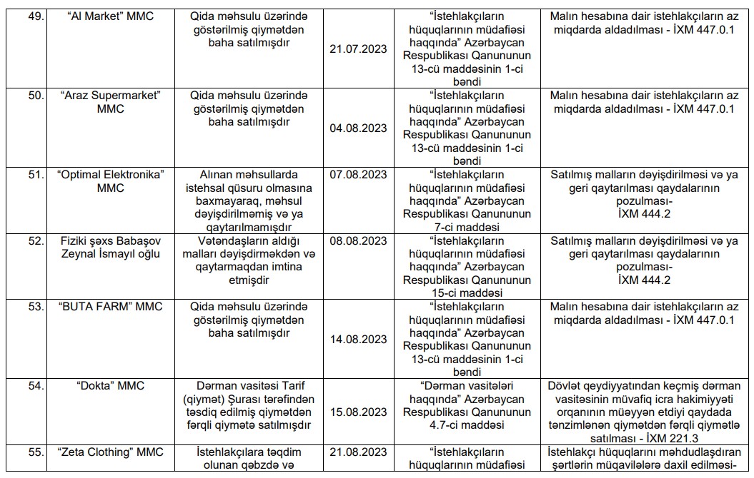 İstehlakçı hüquqlarının müdafiəsi və istehlak bazarına nəzarət sahəsində sahibkarlıq fəaliyyəti ilə məşğul olan fiziki və hüquqi şəxslər barədə tərtib olunmuş protokollara dair ətraflı məlumat: