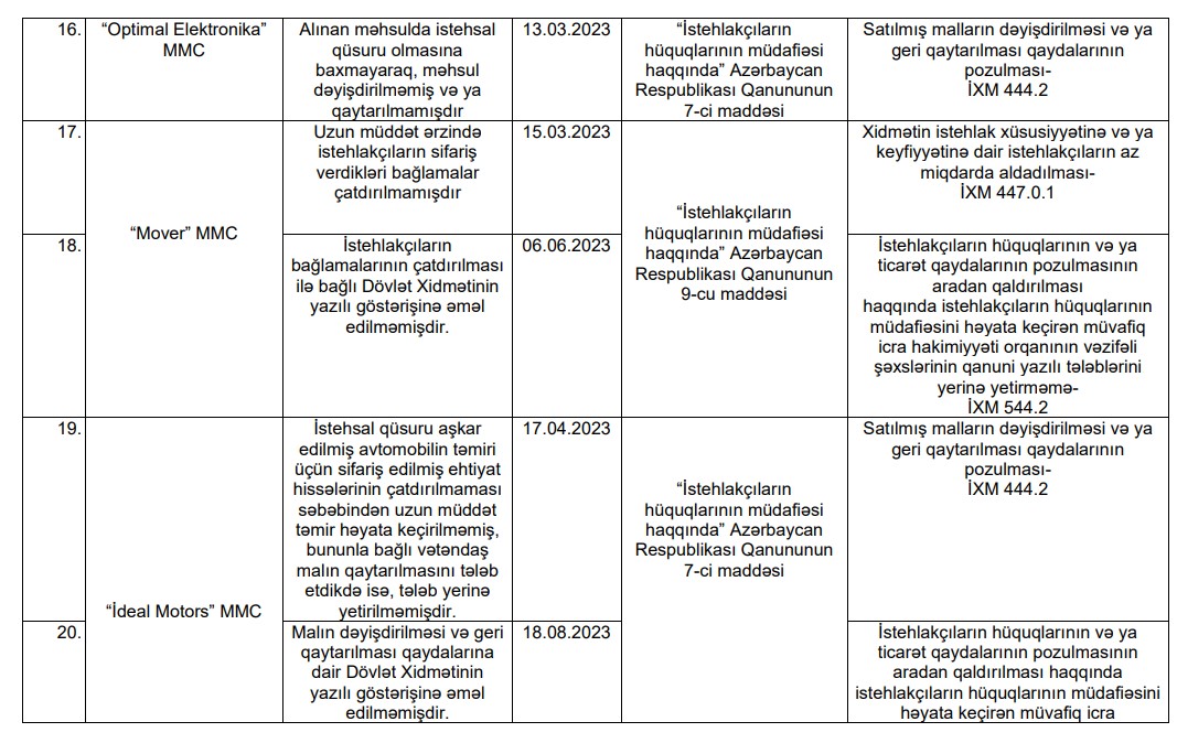 Qeyd edək ki, istehlakçıların elektrik, su, qaz, istilik təchizatı, telefon, internet, poçt rabitəsi, dəmiryolu, hava yolu nəqliyyatı və digər xidmətləri göstərən təbii inhisar subyektlərinin fəaliyyəti ilə bağlı müraciətləri də yuxarıda qeyd olunan göstəricilərə daxildir.