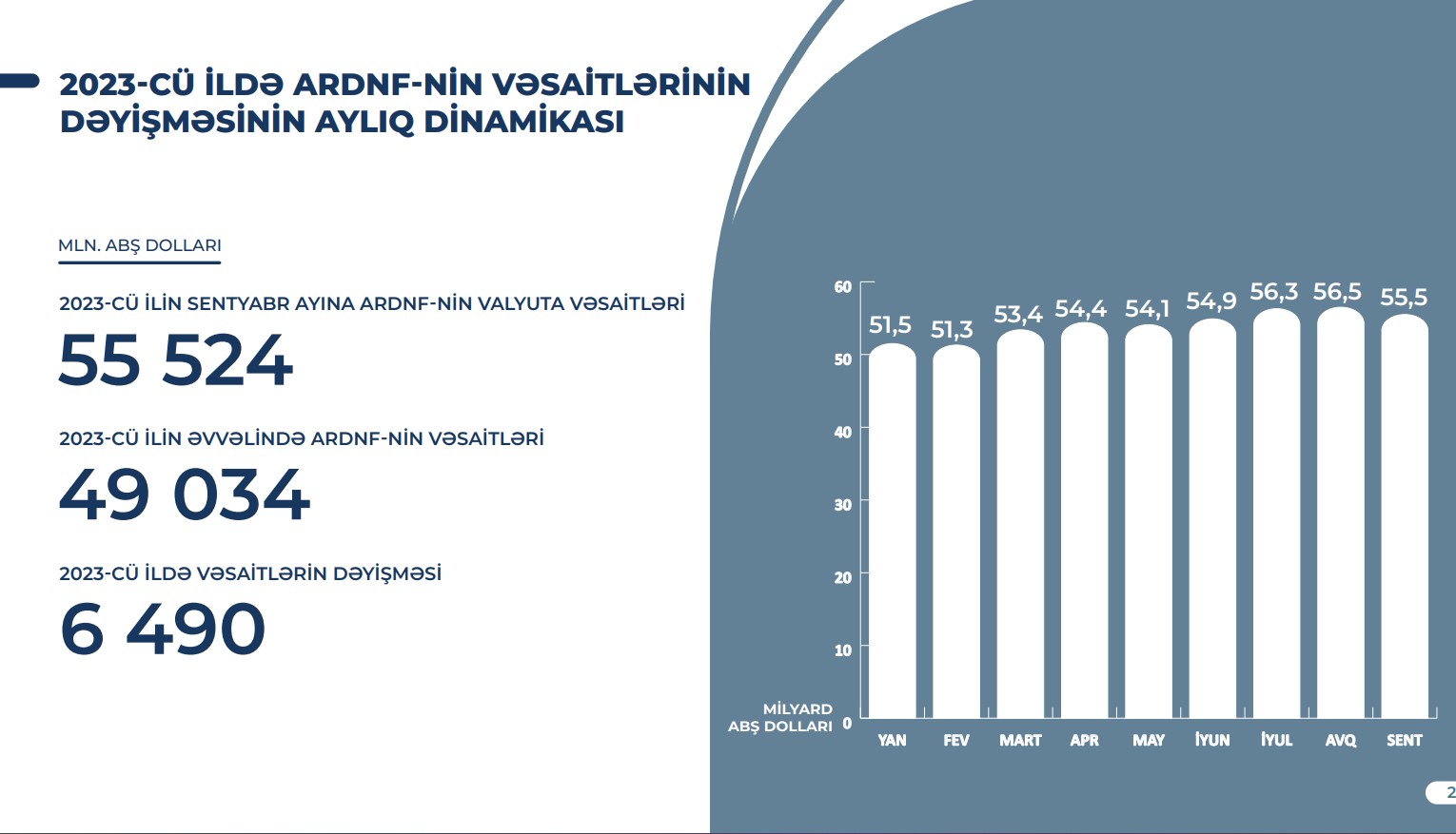 2023-cü il sentyabrın 30-na olan vəziyyətə görə, ARDNF-in aktivləri 55 milyard 523,96 milyon dollar təşkil edib, bunun 2,69 milyon dolları Azərbaycan manatına ekvivalentdir, qalanı digər valyutalarda yerləşdirilib.