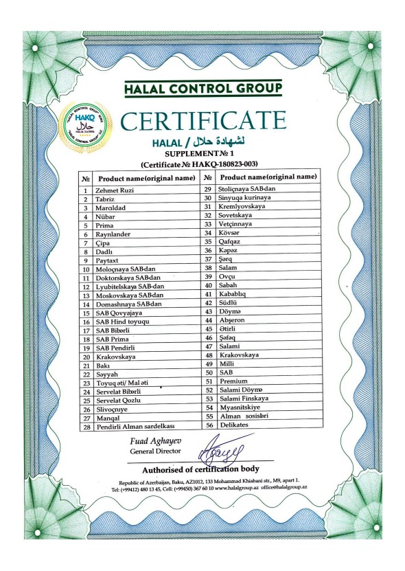 Kolbasa istehsal edən Azərbaycan şirkəti beynəlxalq Halallıq Sertifikatı ilə təltif edildi
