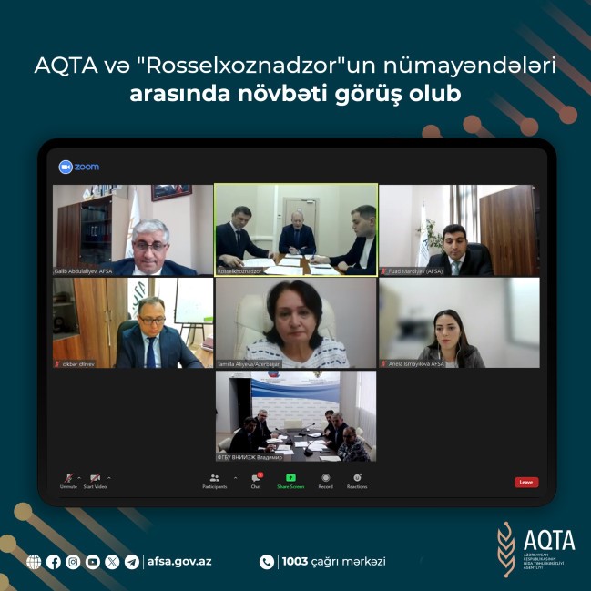 Azərbaycan Respublikası Qida Təhlükəsizliyi Agentliyinin (AQTA) və Rusiya Federasiyasının Baytarlıq və Fitosanitar Nəzarət üzrə Federal Xidmətinin ("Rosselxoznadzor") nümayəndələri arasında növbəti onlayn görüş keçirilib.
