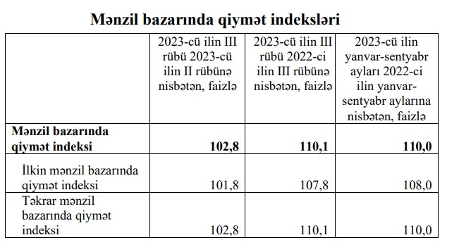 2023-cü ilin 3-cü rübündə mənzil bazarında qiymət indeksi əvvəlki rüb ilə müqayisədə 2,8 faiz artıb.