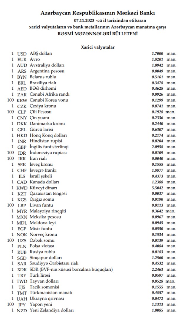 Rəsmi məzənnələr açıqlandı