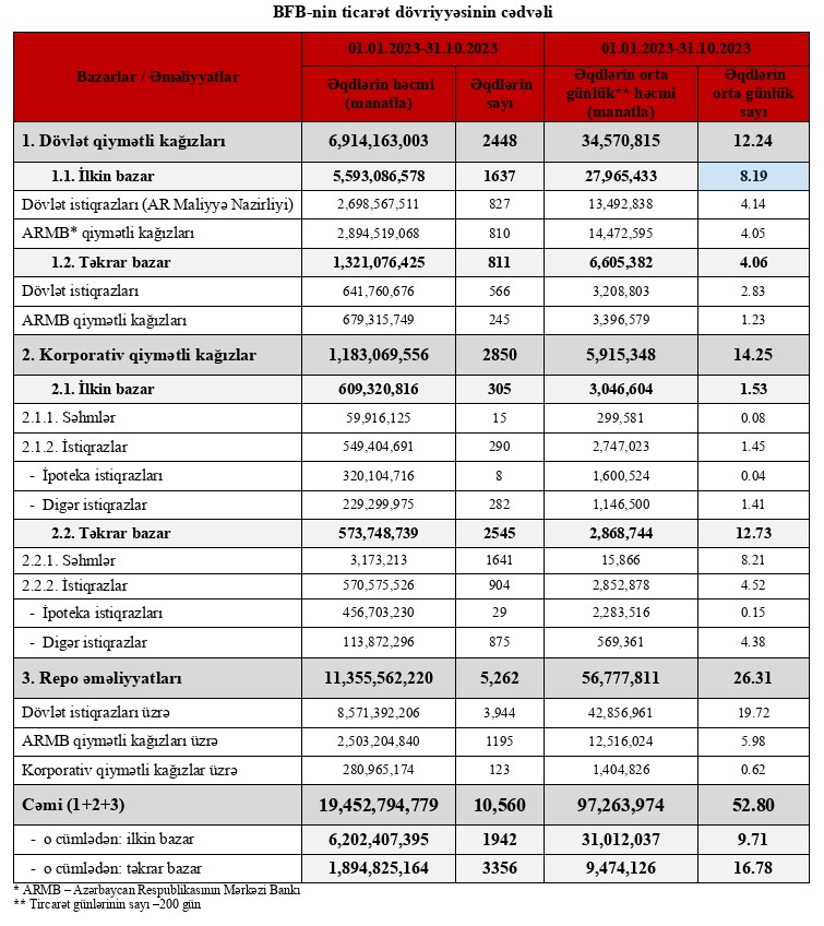 Bakı Fond Birjasında 2023-cü ilin yanvar-oktyabr ayları ərzində qiymətli kağızlar üzrə keçirilən əməliyyatların ümumi həcmi 19 milyard 452 milyon 795 min manat təşkil edib.