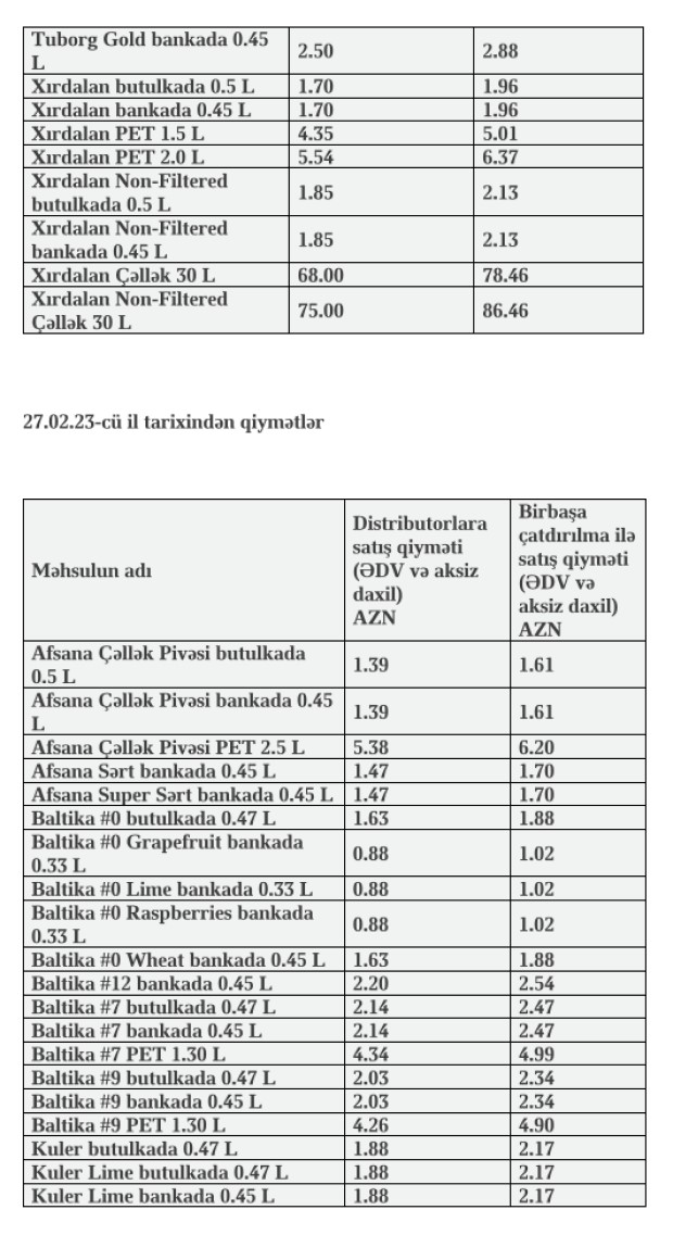 Məsələn, Əfsanə Çəllək Pivəsi butulkada 0.5 L məhsulunun distributorlara satış qiyməti 9 qəpik artırılaraq 1,48 manata, Baltika 7 butulkada 0.47 L məhsulunun qiyməti 8 qəpik artırılaraq 2,22 manata, Kuler Lime butulkada 0.47 L məhsulunun qiyməti 8 qəpik artırılaraq 1.96 manata, Carlsberg butulkada 0.45 L məhsulunun qiyməti 16 qəpik artırılaraq 2.50 manata, Tuborg Green butulkada 0.5 L məhsulunun qiyməti 16 qəpik artırılaraq 2.30 manata, Xirdalan butulkada 0.5 L məhsulunun qiyməti 8 qəpik artırılaraq 1.70 manata, Xırdalan PET 2.0 L məhsulunun qiyməti 16 qəpik artırılaraq 5.54 manata çatdırılıb.