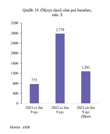 Azərbaycana 2021-ci ilin 9 ayında 772 milyon dollar, 2022-ci ilin 9 ayında 2 milyard 779 milyon dollar pul baratları daxil olmuşdu.