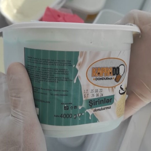 Azərbaycan Respublikasının Qida Təhlükəsizliyi Agentliyi nəzarət tədbirləri çərçivəsində Bakı şəhərinin Səbail rayonu, Neftçilər prospektində fəaliyyət göstərən, fiziki şəxs Əliyev Əmirxan İntiqam oğluna məxsus dondurma emalı və satışı obyektində Agentliyin əməkdaşları tərəfindən plandankənar yoxlama keçirilib.