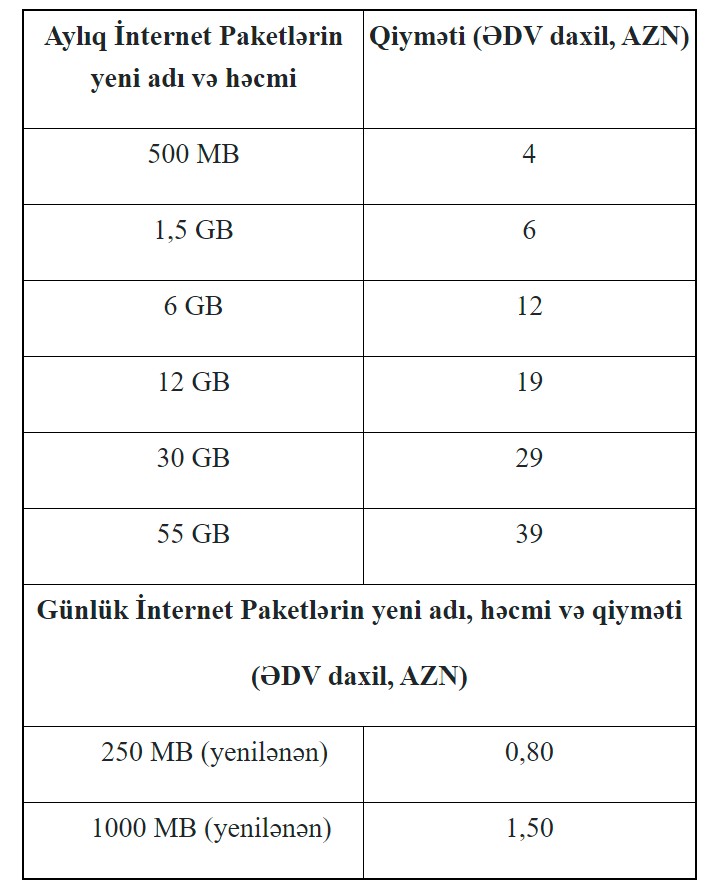 Əlavə edək ki, hazırda “Azercell Telekom”un qüvvədə olan aylıq İnternet tariflərinə görə, 500 MB 3 manata, 1 GB 5 manata, 5 GB 10 manata, 10 GB 15 manata, 30 GB 25 manata, 50 GB 30 manata təklif olunur.