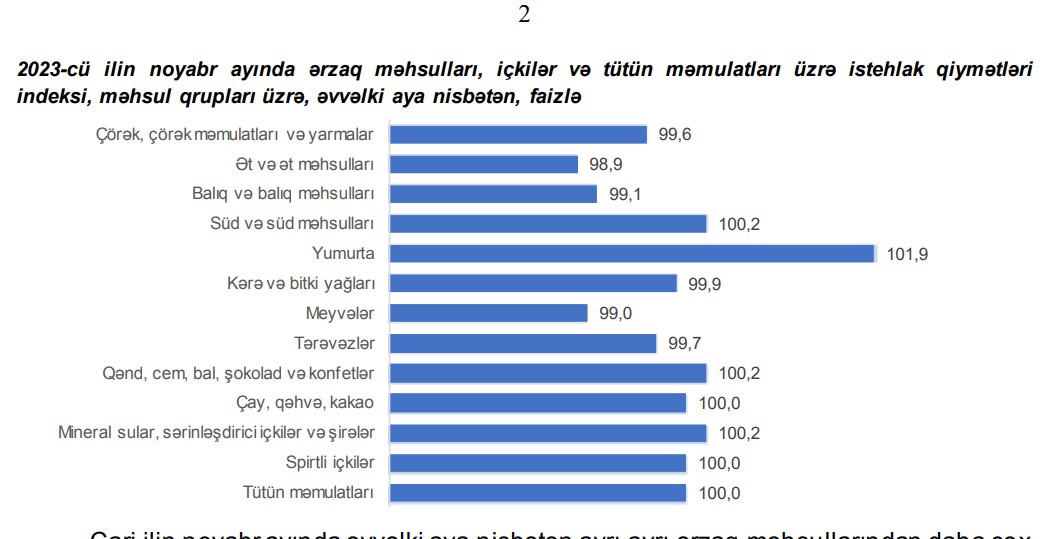 Cari ilin noyabr ayında əvvəlki aya nisbətən ayrı-ayrı ərzaq məhsullarından daha çox ucuzlaşma çörəyin, qarabaşaq və manna yarmasının, mal, qoyun və toyuq ətinin, təzə balığın, süfrə marqarininin, qarğıdalı və günəbaxan yağlarının, naringinin, portağalın, limonun, almanın, heyvanın, narın, xurmanın, kivinin, kələmin, balqabağın, yerkökünün, çuğundurun, soğanın, kartofun, şəkər tozunun, bahalaşma isə əsasən pasterizə olunmamış üzlü südün, yoqurtun, yumurtanın, zeytun yağının, bananın, üzümün, xiyarın, pomidorun, sarımsağın, şəkərin, qəhvənin, meyvə şirəsinin qiymətlərində müşahidə olunmuşdur. Digər ərzaq məhsullarının qiymətlərində ciddi dəyişikliklər baş verməmişdir.